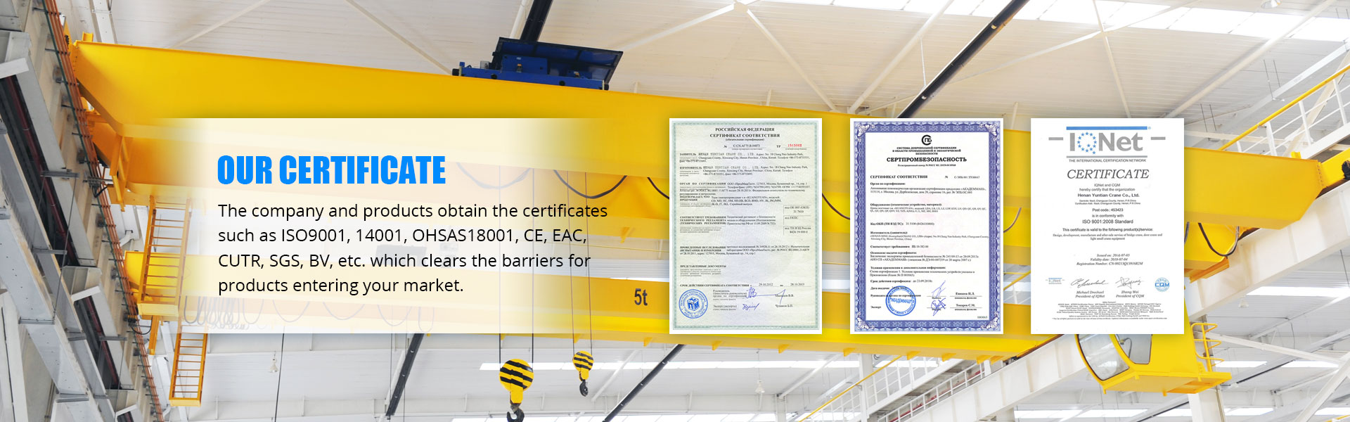 Við gætum veitt þér alls konar krana iðnaðar frá 0,25tons til 900tons, fara í GB / T 19001-2000 idt ISO 9001: 2000, GB / T 24001-2004 idt ISO 14001: 2004, GB / T 28001-2001, OHSAS 18001: 1999, CE, GOST, SGS, TUV, BV og svo framvegis.