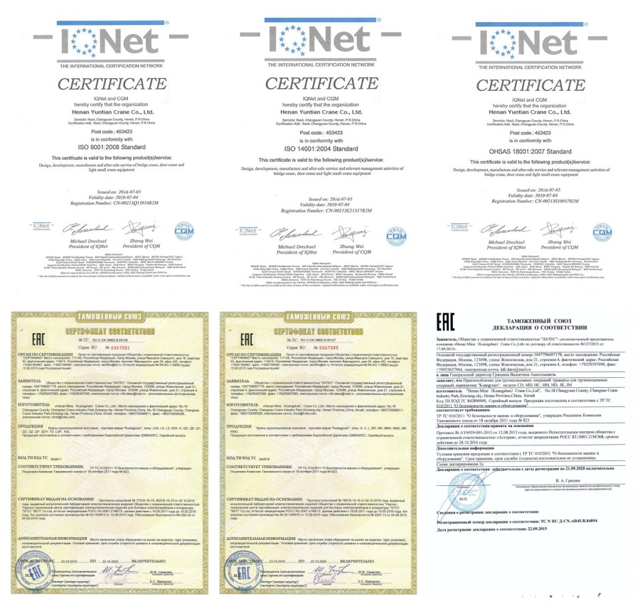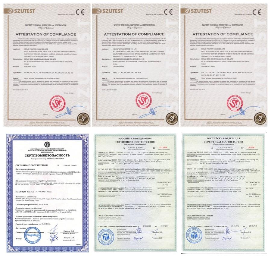 Kran okkar hefur staðist CE, ISO, GOST, SGS, TUV, BV, og svo framvegis.